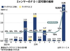 ミャンマー投資委員会(MIC)によると、2022年8月の海外直接投資(FDI)認可額(ティラワ経済特区=SEZ=を除く)は11億9,853万米ドル(約1,640億円)、認可数は19件になった。ともに過去1年で最大だった。シンガポールや中国の企業による複数の案件が認可されたためだ。金額が10億米ドルを超えたのは昨年5月以来のこと。ただ専門家は、政情不安が続き投資環境が好転していないとして、先行きには厳しい見方を示した。
