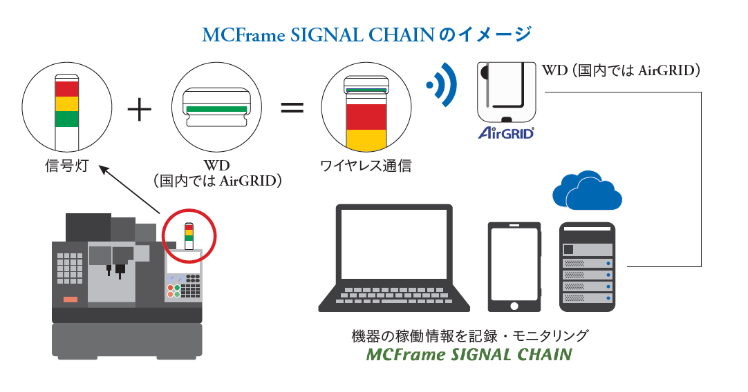 MCFrame SIGNAL CHAIN の構造は至ってシンプル。工場内の設備に設置された、既存の信号灯に無線の送信機を取り付けるだけで、運転・停止情報を記録することができる。それらの情報はインターネットを通じて参照できるため、日本のマザー工場はもちろん海外のサテライト工場もリアルタイムでモニタリングができる。