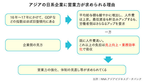NNAグローバルリサーチグループの早川明輝氏は「現場の前線で動くジュニアクラスの営業人材は、日系企業間でも取り合っている。競合他社からの引き抜きを阻止しようと昇給せざるを得ない状況になっていることが背景にある」と分析する。