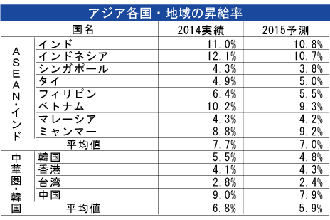 日系企業最大の進出先である中国の賃上げ率見込みは7.9%で、14年実績の9.0%から減速。中国に代わる投資先になりつつある東南アジアでも、インドネシアが10.7%、ベトナムが9.3%で、それぞれ14年実績を下回った。インドは10.8%で、14年実績の11.0%からやや下がった。