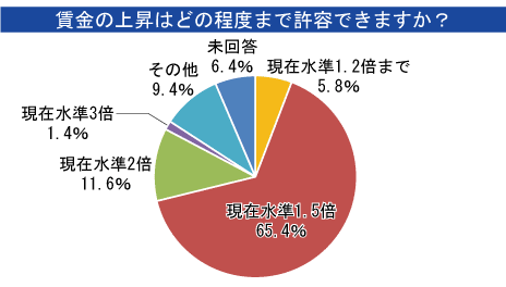 今後の賃金水準について「どの程度まで許容できるか」を聞いたところ、約7割の企業が「現在の1.5倍まで」、約1割が「現在の2倍まで」と答えた。
