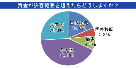 仮に許容範囲を超えた場合は、2割以上が「国内の別の地域もしくは国外移転を視野に入れる」、1割近くが「拠点のある国・地域から撤退を検討する」と回答。それ以外では「日本人駐在員を削減する」「生産ラインを自動化する」などの声が挙がった。