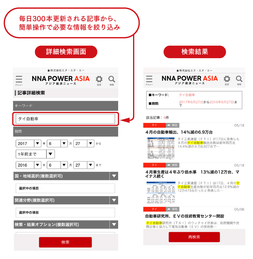 - 1997年から蓄積された100万件以上の記事からキーワード、期間、国・地域、分野を指定して、読みたい記事や欲しい情報を探し出せます。