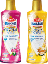 8月には新商品「クリスタルシャイン」(写真下)を投入。光をより反射できる成分を加え、掃除するたびに床が輝くことを訴求する。近年タイの新築住宅では、より光沢度の高いタイル床が増えており、住環境の変化に伴うニーズを取り込む狙いがある。香りも香水のような高級感を持たせ、ボトルはダイヤカットに仕立てた。野島氏は「おしゃれできれいな家を保ちたいと考える人が増え、床掃除をより重視するようになっている」と話す。