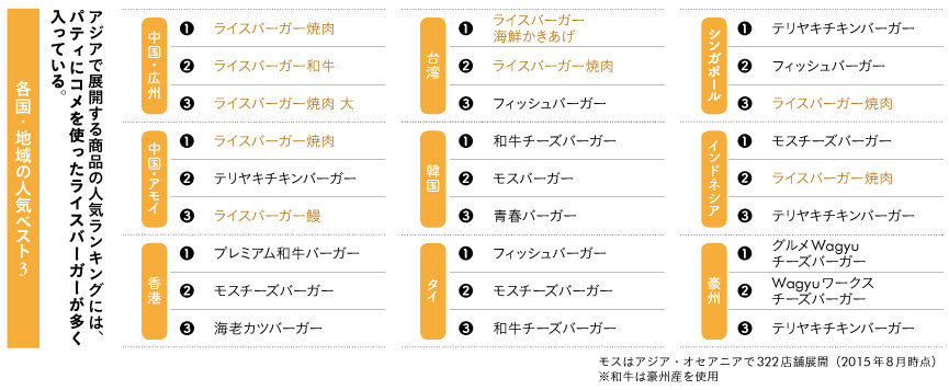 各地で開発して、その他の国・地域に広がった商品もある。ライスバーガー鰻(うなぎ)はシンガポール発祥で台湾~中国へと広がった。