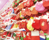 特にサンタ帽は、手軽に着用できてクリスマス気分を盛り上げられるため数が出る。大きな靴下やクリスマスリースも定番商品だ。また、最近は明るいLEDを仕込んだ置物やデコレーションライトもよく売れている。どの商品も2シンガポールドル(約175円)だ。