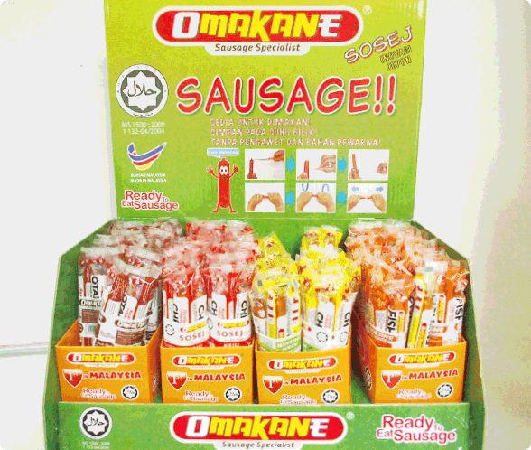 加工食品大手の林兼産業(山口県下関市)が2010年に地場企業と合弁で設立したオマカネが製造販売を行う。年間生産量は合計90トン程度。マレーシアのソーセージは要冷蔵・冷凍品が一般的なため自宅で保存して使うが、オマカネの商品は常温保存が利き、包装材をむけばすぐに食べることができるのが特長だ。利用シーンはぐっと広がる。