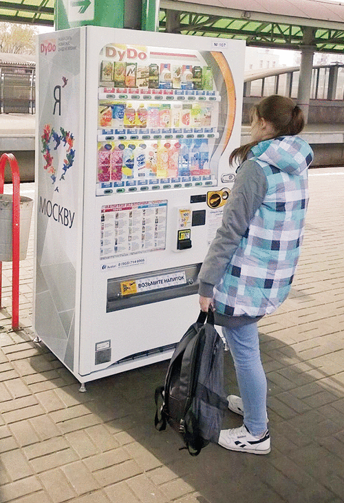 モスクワの鉄道駅ホームに設置されたダイドーの自販機。ほかに空港、バス停、地下道、百貨店、オフィスにも設置している。市内に自販機は少なく競合はコカ・コーラとイタリア製のカップ式販売機がある程度だ。ダイドー製品は全て日本製で表記も日本語。売れ筋はフルーツテイストの清涼飲料で容量500ミリリットルの大きなものが人気(同社提供)