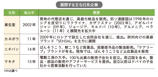 旧ソ連圏諸国の経済に詳しいロシアNIS貿易会の中馬瑞貴研究員は「市場性はあり、日系企業の関心が高まっているのも間違いない。富裕層狙いの消費財は有利だろう。製造業の基盤のない国だから進出分野は限られるが、ロシアでの販売経験があれば有利に進められるのでは」と話す。