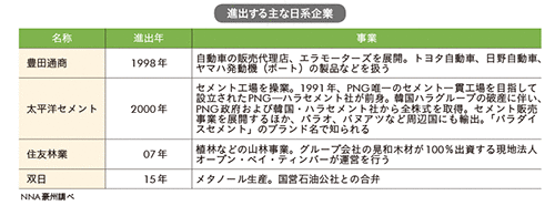 その他の大手では、双日がPNGの国営石油公社(NPCP)と同国産の天然ガスを利用したメタノール生産事業の合弁会社を設立し、事務所をポートモレスビーに置く。また、住友林業のグループ会社が山林事業を、太平洋セメントが韓国企業から取得したセメント製造事業を現地で展開している。
