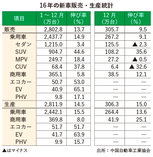 中国自動車工業協会は1月12日、中国における2016年の新車販売台数が前年比13.7%増の2,802万8,000台に達し、過去最高を更新したと発表した。政府の小型車減税策を追い風に販売が拡大し、伸び率は前年を9.0ポイント上回った。同協会によると中国の新車販売は8年連続で世界一となっている。