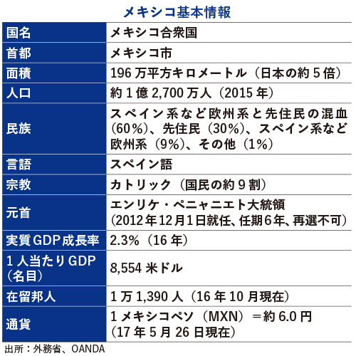 「メキシコに工場を作るなど、ありえない!」――。今年2月に米国大統領に就任したトランプ氏の一連の発言で、日本でのメキシコへの注目度は一気に高まった。メキシコには、安い人件費で組み立てた自動車を北米自由貿易協定(NAFTA)で米国にゼロ関税で輸出できるメリットがあることから、日本からも主要な自動車メーカーや多くのサプライヤーが進出しているためだ。