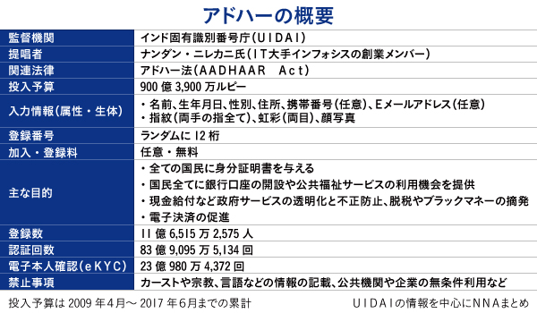 登録作業は民間業者にも委託した。10年9月27日に初めてアドハー番号を国民に割り振り、17年1月末時点で11億1,000万人以上が登録。保有率は人口の9割弱に達した。また、生体認証システムで本人を確認した上で開設された銀行口座は17年1月末時点で4,470万件に上った。