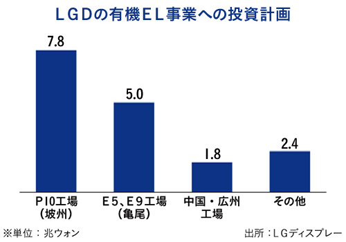 京畿道坡州市に建設中の新工場「P10」に総額7兆8,000億ウォンを投じる。10.5世代(2,940ミリ×3,370ミリ)ガラス基板のディスプレー生産ラインに2兆8,000億ウォン、中・小型の有機ELには5兆ウォン、それぞれ投入する。中・小型パネルへの投資額は、現在建設中のE5、E6工場(ともに慶尚北道亀尾市)を含めて計10兆ウォン規模となる。