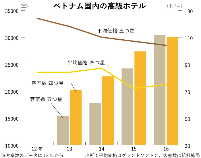 宿泊料の低下は、客室数の増加が要因だ。ベトナム統計総局(GSO)によれば国内の五つ星の客室数は16年に3万400室で13年からほぼ倍増、四つ星も3万室で5割増加した。五つ星は16年だけで6,000室増えている。
