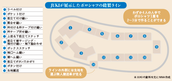 工業用ミシン世界最大手のJUKIは昨年、大阪で開かれた「国際アパレル機器&繊維産業見本市」(JIAM)にポロシャツの縫製ラインを展示した。コンセプトは、最先端のミシンや自動機を導入して生産性を向上させた「スマートファクトリー」。従来、13人ほどの人手がかかるところを、4人でポロシャツ1着を作る工程を実演した。1着を仕上げるのにかかる時間はわずか2〜3分という。