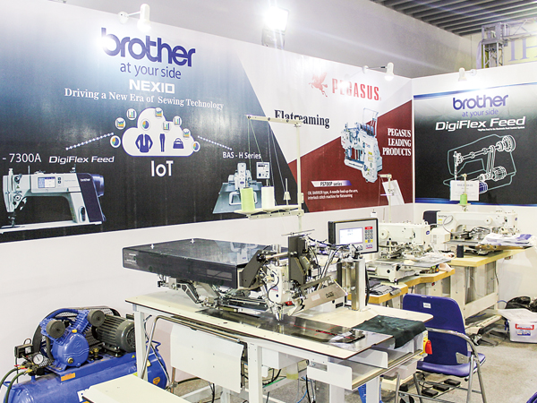 ブラザー工業は、工業用ミシン「ネクシオ」シリーズなどを展示した。同商品はモノのインターネット(IoT)を活用し、作業工程の自動化や生産ラインの見える化を行うことを見据えた次世代の縫製機器で、既に販売を開始している。ミシンに搭載されたタッチパネル式の液晶画面を操作すると、縫製パターンなどを簡単に設定できる。またUSBポートを備えていて、ミシン間での設定データのコピーやソフトウエアの更新も可能になった。