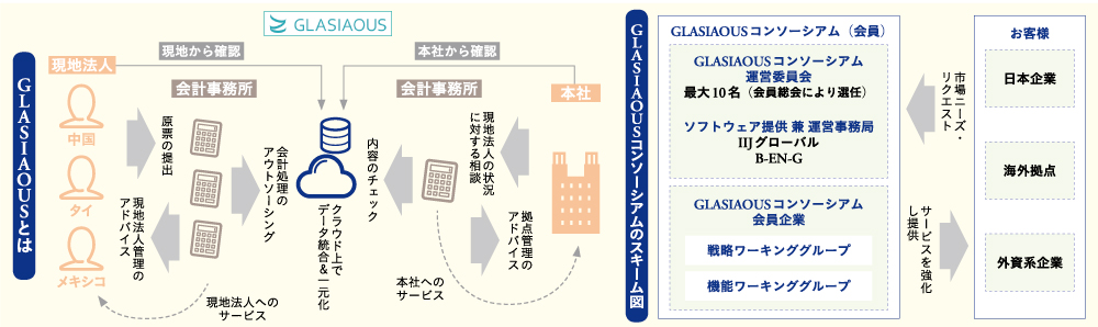 今年8月には、ソフトウエアの提供や運営事務を担うB-EN-GとIIJグローバルに加え、会計・税理士法人の8社が運営委員会を構成する事業体「GLASIAOUSコンソーシアム」が発足した。市場のニーズやリクエストを一元的に吸い上げてサービスや機能を強化し、市場に還元するのが目的。運営委員会は戦略やマーケティングにかかる「戦略ワーキンググループ」と、機能やサービスにかかる「機能ワーキンググループ」を設置し、定期的に協議を開く。会員企業には、運営委員会の10社にベトナムとタイの会計・税理士法人の計2社も加わる。
