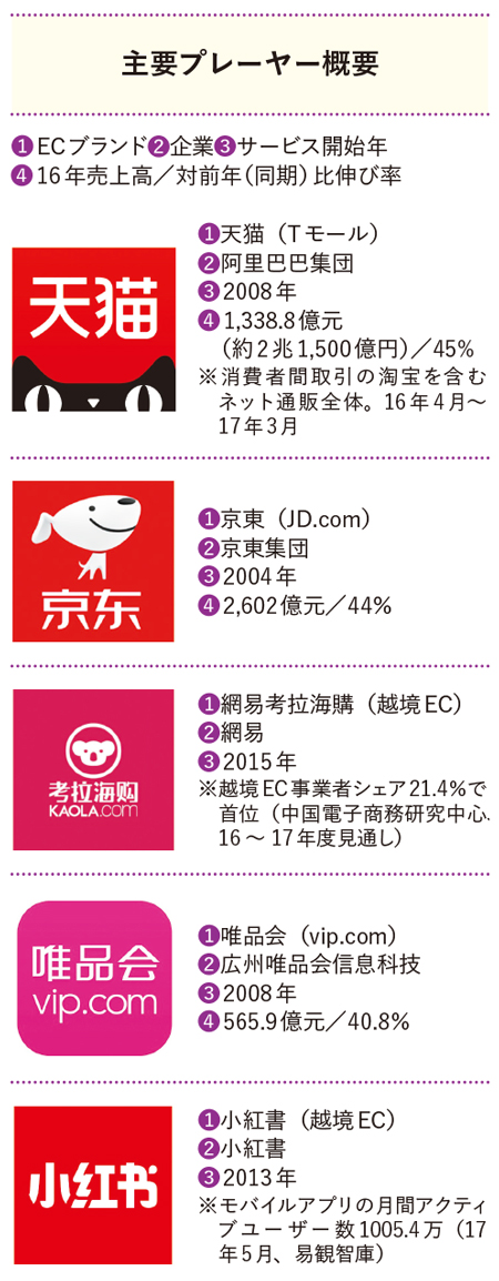 日中越境ECに携わり、日本商品の中国向けプロデュースなども行う中国市場戦略研究所(東京都中央区)の徐向東代表によると、中国EC市場の主要プレーヤーは以下の通り。