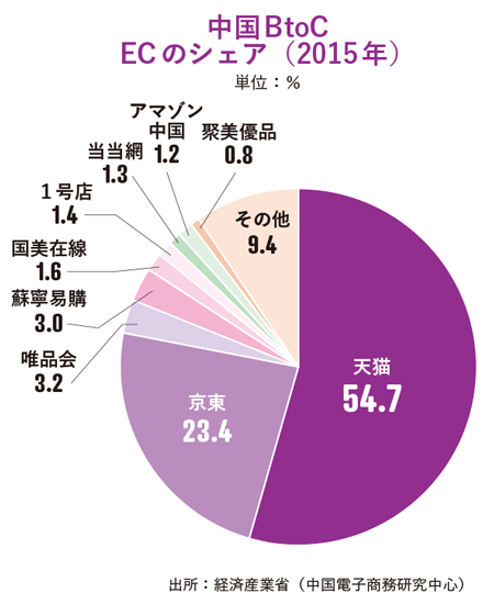 爆発的成長が続いている。17年時点の利用者は5年前より3倍増の4億人を超え、15年のEC消費額は個人消費の15%を占めたと言われている。