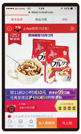 中国のネット通販サイトで毎年11月11日前後に行われる一大販促イベント「双十一(独身の日)」。昨年の双十一、カルビーが天猫国際に設けた旗艦店には35万人の来店、14万人の購入者があった。販売額は11月11日だけで1,800万元(約3億1,000万円)に上った。このうちシリアル商品「フルグラ」が1,400万元と大半を占めている。販売袋数は31万袋に達し、計画の30万袋を上回った。フルグラの通常価格(800グラム×2袋)129元を、11月11日午前0時~1時59分に99元で、同2時から109元で販売するなど、大幅な割引が奏功したようだ。