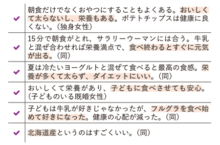 中国の女性の消費者からはフルグラについて以下のような声が上がっている。