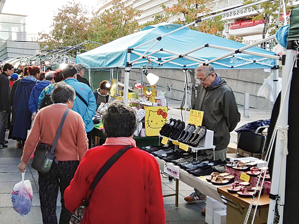 ノルウェージャン・ジョイが接岸した埠頭(ふとう)には、中国人客向けに土産物を売るテントが並んでいた=17年11月
