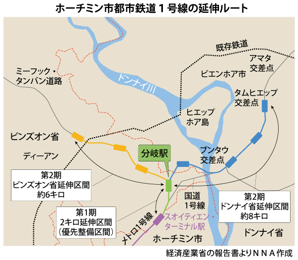 経産省の延伸案では、ホーチミン市北東のスオイティエン駅から北に2キロ離れたディーアン町ビンタン地区にまず分岐駅を作る。分岐駅からはミーフック―タンバン道路沿いに西に向けてディーアンを横切る3駅6キロの区間と、北東方向にビエンホア市まで4駅8キロを走る区間に分かれる。トイバオキンテーサイゴンによれば、ホーチミン市はビンズオン省およびドンナイ省に書面で経産省の延伸ルート案に同意することを伝えた。経産省の提案は、調査受託先の日本工営と東京急行電鉄がまとめている。