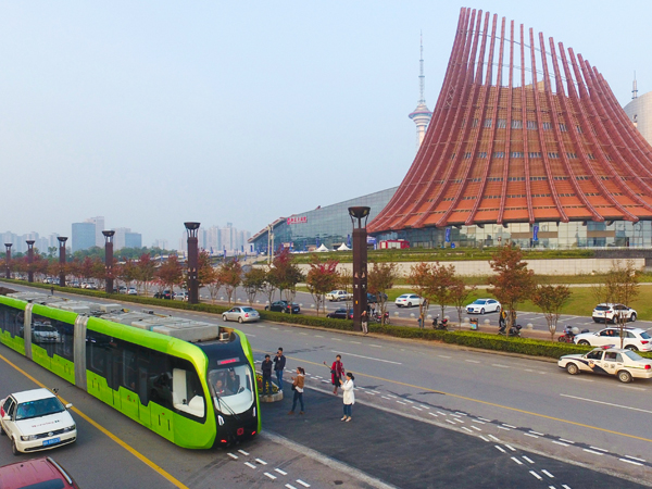 1編成は3~5両で、定員は300~500人。10分間の充電で25キロメートルの運行が可能という。路上に引かれた白線に沿って走行し、最高時速は70キロ。レールを敷設する必要がないため、工期は1年程度で済み、建設費用を大幅に削減できるのが特徴だ。