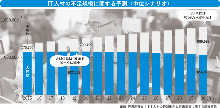 ビッグデータやモノのインターネット(IoT)、人工知能(AI)などをキーワードに急速な拡大が見込まれるIT人材需要。しかし、日本のIT産業はその反対に、人手不足が深刻化するとみられている。