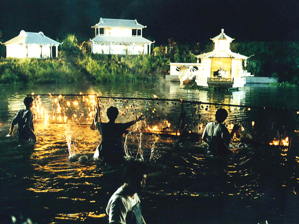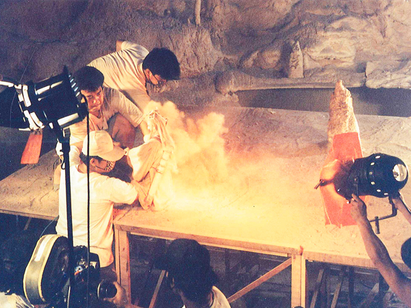人形の操演を行う人形師は通常、「半山」と呼ばれる高さ150センチほどの平台セット上、もしくはセットの前後で操演を行いますが、オープンセットでは地面に深さ150センチの溝を掘り対応しました。また、メインセットの一つ、琉璃仙境(るりせんきょう)は水面セットでしたが、池の底にも溝を掘り、人形師は顎まで水に浸かった状態で操演を行いました。『聖石傳説』はこのようにさまざまな革新と努力を重ね、テレビシリーズでは決して味わえない迫力、スピード、映像美を備え、独創性に富んだ極上の娯楽映画に仕上がりました。