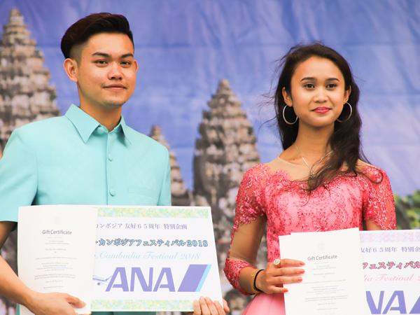 特別企画として行われた「ミス&ミスターコンテスト」。ファイナリストとして女性9人、男性6人が登場。ミスに選ばれた富倉晴美さん(20)は在日カンボジア人二世の大学生。「選ばれてうれしい。将来は日・英・カンボジア語を使い、両国の架け橋になれる仕事をしたい」。ミスターに選ばれたセーン・ソッリーさん(23)は、王立プノンペン大学で日本語を専攻する大学生で、現在、日本留学中。「予想外の結果で驚いている。将来は日本企業に就職し、通訳として両国をつなぎたい」
