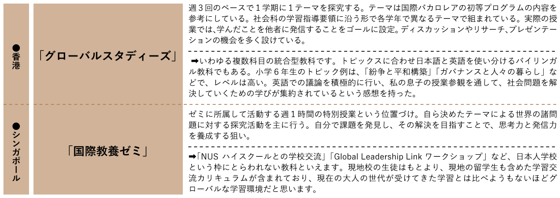 「グローバルクラス」という特別なカリキュラムを組んだ日本人学校も出てきています。2016年4月に香港日本人学校香港校で小学4年生から開講。17年4月には、シンガポール日本人学校中学部でも1年生と2年生でスタートしました。このクラスでは、国語と一部教科を除いては、英語で学習を進めます。中でも、香港日本人学校の「グローバル・スタディーズ」や、シンガポール日本人中学部の「国際教養ゼミ」は、グローバルクラスの看板授業になっています。この2クラスの概要は、下記の表を参考になさってください。