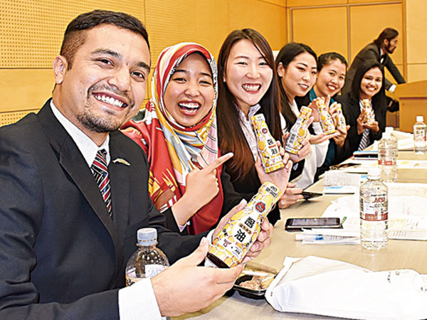 日本の大学で、増える外国人留学生らのさまざまなアイデアを生かす取り組みが広がっている。世界89カ国・地域、約3,000人の留学生が在籍する立命館アジア太平洋大学(APU・大分県別府市)の学生らが民間企業と共同開発したハラル(イスラム教の戒律で許されたもの)認証を取得した食品「ハラールはちみつ醤油」が1月に発売された。APUは従来から「実践を通じての学び」に力を入れているが、実際に商品完成にこぎ着けたのは初めて。APUの生協では発売から3週間で200本を売り上げる好調ぶりだ。(取材・写真=NNA北九州事務所 吉岡由夏)