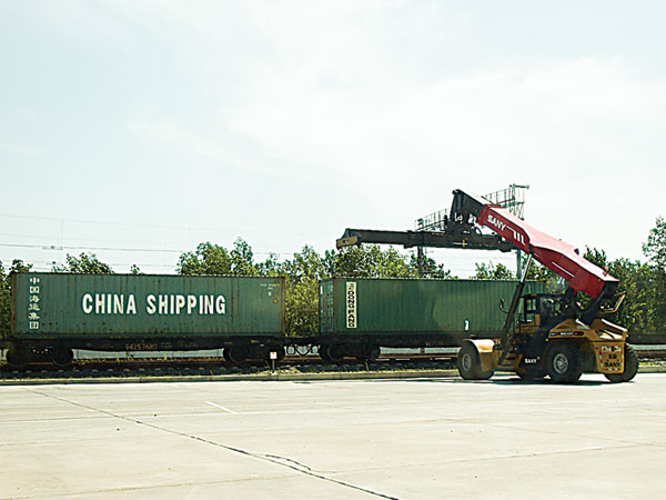 工場には鉄道の引き込み線もある。「中国海運」「東風」と書かれたコンテナが貨車から降ろされていた