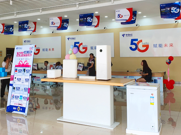 5G一色の中国電信の販売店=中国・大連
