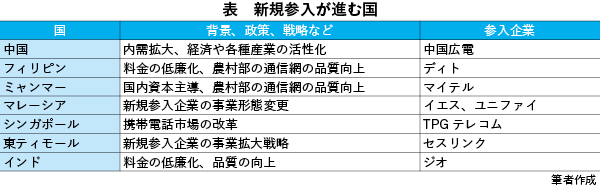 最近では、つい先ごろの今年3月31日にシンガポールで約19年ぶりの新規参入としてTPGテレコムが携帯電話事業を開始しました。同じく年内に中国の中国広播電視網絡(中国広電、CBN)、21年中にはフィリピンのディト・テレコミュニティ、さらに時期は未定ながら東ティモールのセスリンクも参入を計画しています。