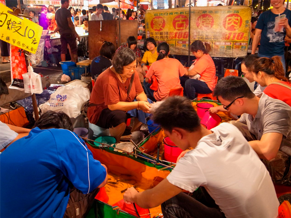 同じく花園夜市のエビ釣り屋台の風景。1回10台湾元(約36円)だが技術が必要