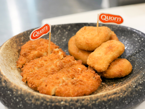 クォーンの代替肉商品で、アジアで売れ筋のナゲット(右)とカツ=同