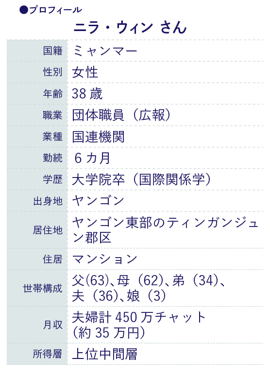 家庭では、3歳10カ月になる女の子の母親であるニラさん。ヤンゴン東部の町で、両親、弟、フリーランスのITエンジニアの夫、娘と共に持ち家のマンションで暮らしている。