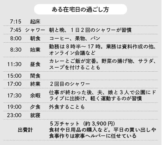 「在宅勤務だと通勤がないので時間の節約になるし、早起きする必要もない。仕事前に家族との時間を持てるようになり、渋滞のストレスからも解放された。また、家族と一緒に自宅で昼食を取るので、外食費の節約にも」と多くのメリットを語る。