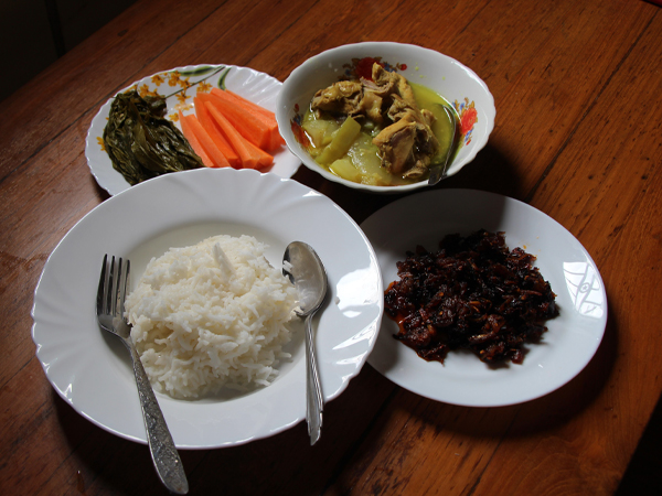 ランチはカレーとご飯が定番。この日は野菜と、エビとタマネギで作ったスパイシーな副菜をプラス(NNA撮影)