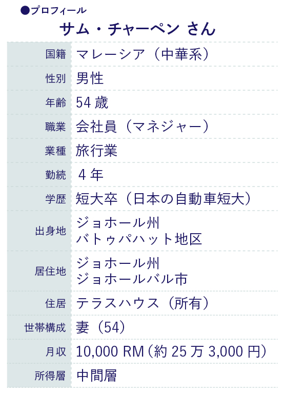 マレーシア南部、シンガポールと国境を接するジョホールバル市在住のサム・チャーペンさん。日系自動車メーカーで20年以上働いてきたが4年前、旅行業界に転職。学生時代からの親友が営む旅行会社に勤務し、自国を訪れる外国人向けのツアー手配や運行を取り仕切っている。