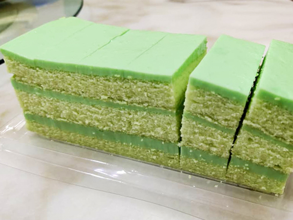 間食のパンダンケーキ。パンダンリーフの葉エキスを用いた緑鮮やかなシフォンケーキで、当地ではポピュラー(同)