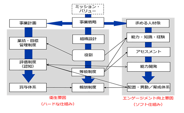 どこまで「想定外を想定」して新しい戦略を考えるのか、または今までの延長線上での戦略実現という考え方もあるかもしれません。新戦略にせよ、既存戦略の延長にせよ、組織の在り方は戦略に大きく左右されることを理解いただきたいと思います。つまり組織とは、戦略を実行するために存在し、人はその組織を構成する最小構成要素となります。そして人事諸制度は、組織で働く人をサポートするインフラストラクチャー(下部構造)として機能します。