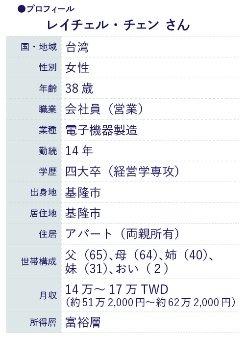 台湾北部に位置し、港町として栄えてきた基隆市で生まれ育ったレイチェルさん。大学では経営学を専攻し、現在はEMS(電子機器の受託製造サービス)世界最大手の鴻海精密工業に勤務。クラウドサービスの営業担当として多忙な日々を送っている。