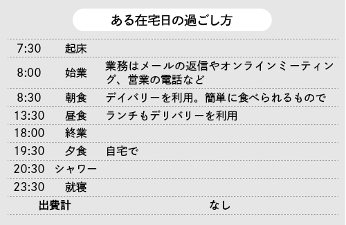 勤務は朝8時から夕方6時まで。短い期間の在宅勤務だったが、「何といっても時間をフレキシブルに使えることが良かった」と彼女。両親が購入した自宅は約170平方メートルと広大だが、「仕事中、親からあれこれ邪魔が入るのがかなりのストレスだった」と本音もぽろり。
