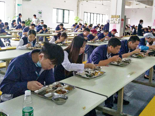 仏山の電子部品メーカーC社では、昼食時に500人ほどが食堂に集まる。対面を避けるため、全員が同じ向きに座るようルールを設定した。この方法だと座席が不足することから、昼食時間を3回に分けて実施している。