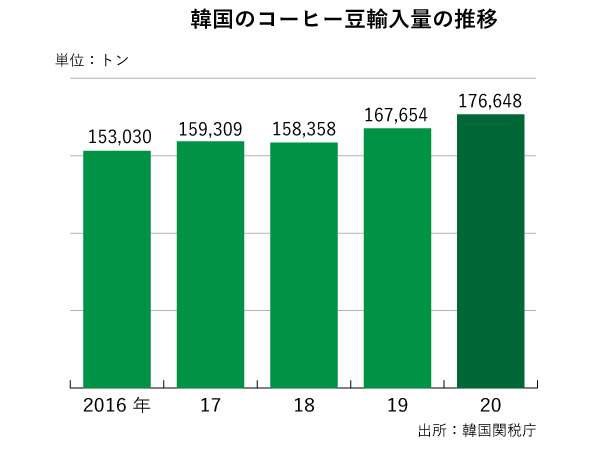 輸入量も増えた。韓国関税庁の貿易統計によると、20年1~8月のコーヒー豆輸入量は17万6,648トンと、前年比5.4%増えた。8月時点で10万トンを超え、その後もペースが衰えず過去最高を更新した。輸入額も7億3,780万米ドル(約763億円)と11.5%増えた。