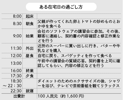 朝8時に起きると、父親が作ってくれたトマトと卵炒めなどの朝食をとり、9時からはオンラインで仕事を開始する。